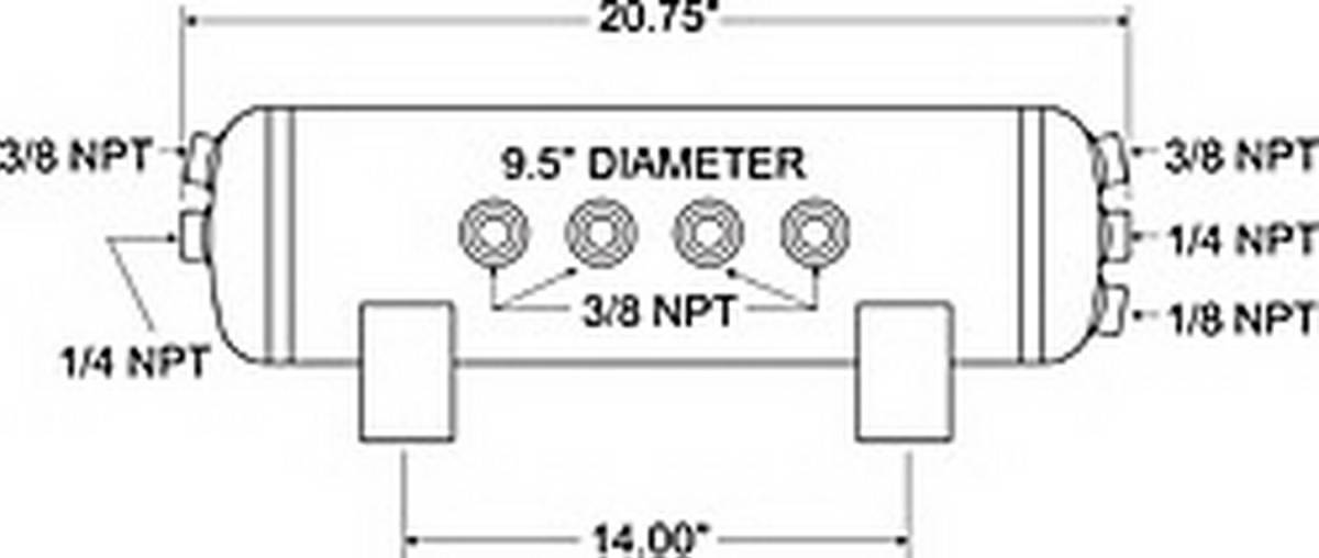 Air Tank; 5 Gallon; 9.5 in. Dia.; 21 in. Length; Six 3/8 in. NPT Ports; Two 1/4 in. NPT Ports; One 1/8 in. NPT Port; 150 PSI Max; Black;