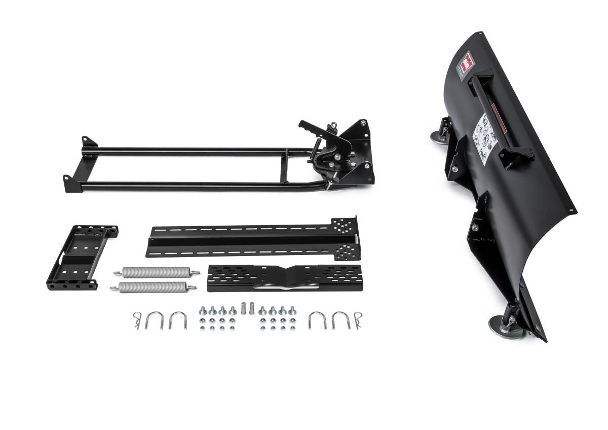 Complete system included, minus winch; 5 position blade angle.; round tube steel chassis; 48" blade, pushtubes, and under-body mount all powder coated finish; includes skid supports; simple to install in approximately 90 minutes