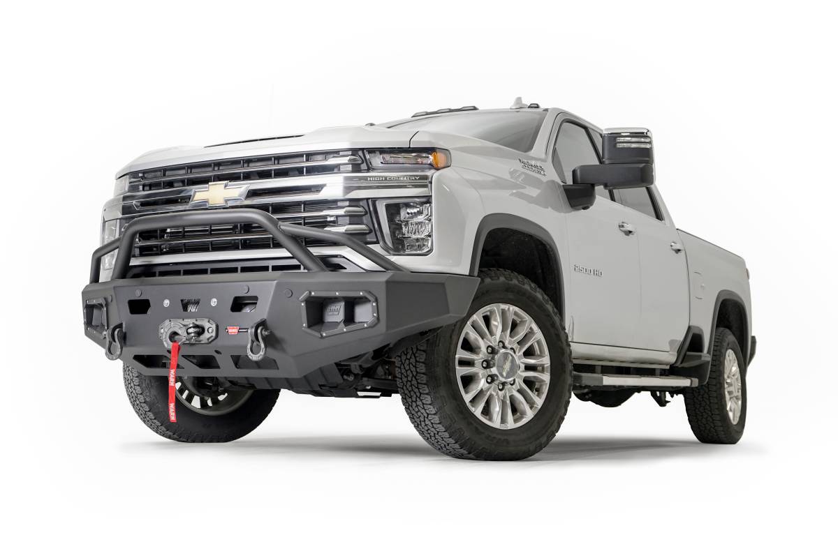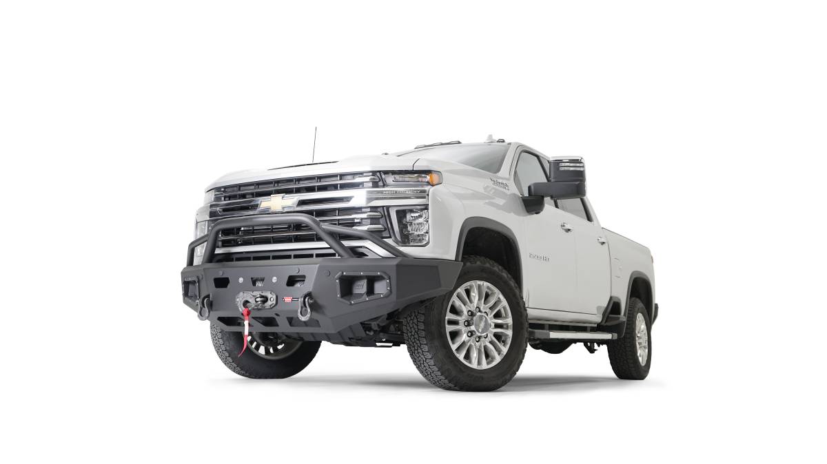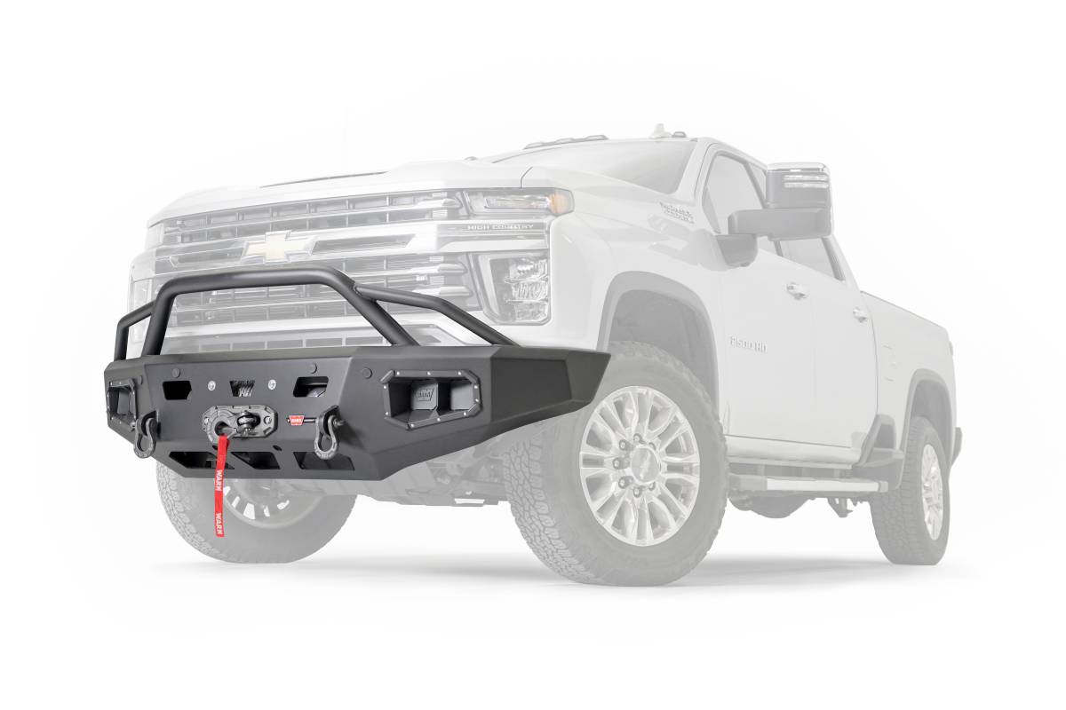 Direct-Fit; Mounting Hardware Included; With Baja Style Grill Guard; With Winch Mount; With D-Ring Mounts; With Light Cutout; Textured Black Steel