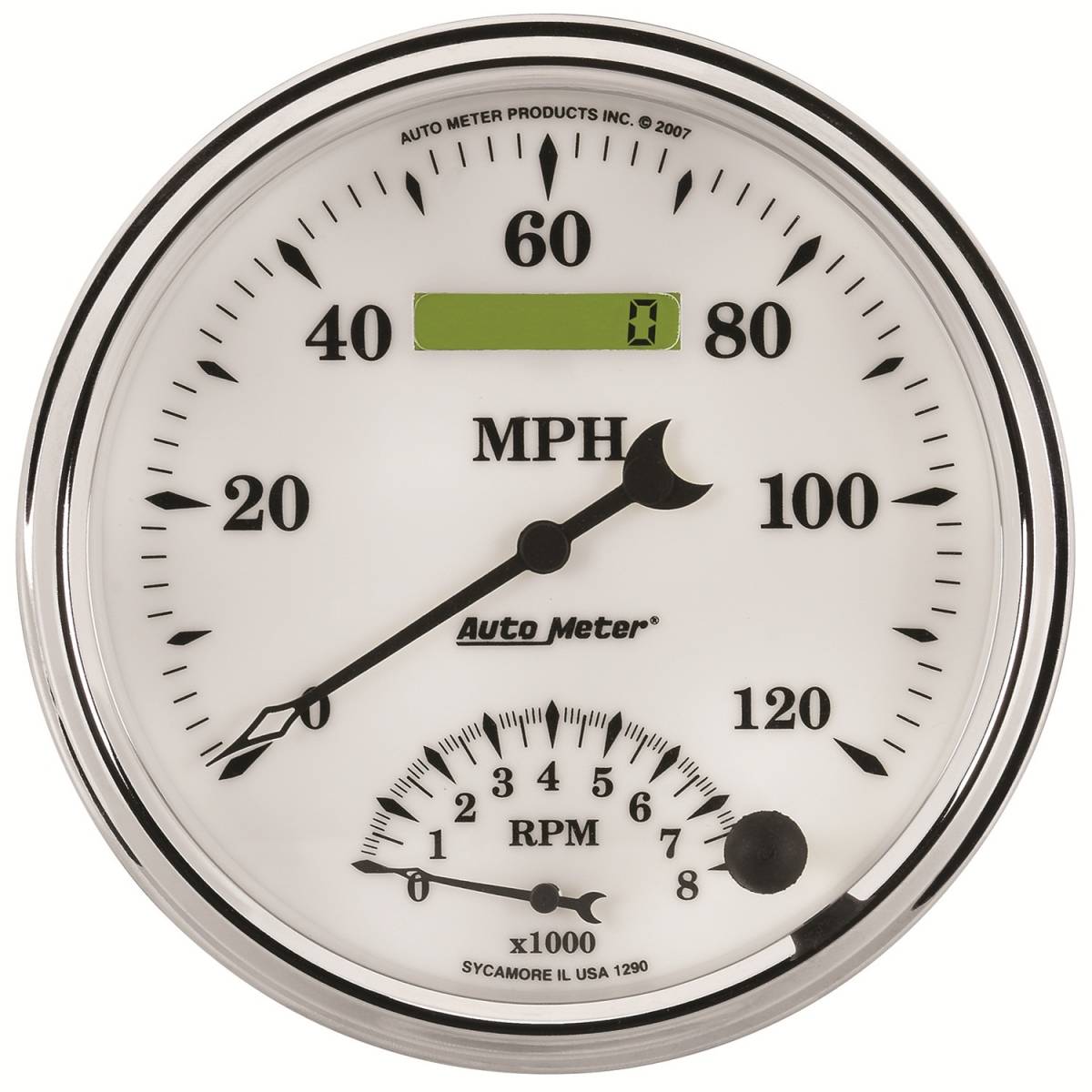 AutoMeter GAUGE, TACH/SPEEDO, 5" , 120MPH & 8K RPM, ELEC. PROGRAM, OLD TYME WHITE II 1290