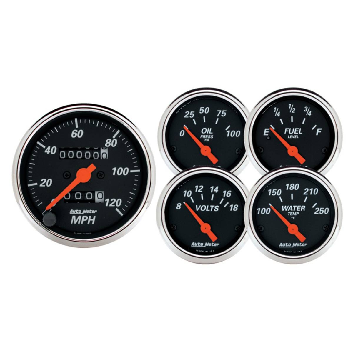 AutoMeter has brought together the most popular gauges into a simple kit. The kit includes a speedometer, water temperature, oil pressure, fuel level, and voltmeter. All senders included where applicable.