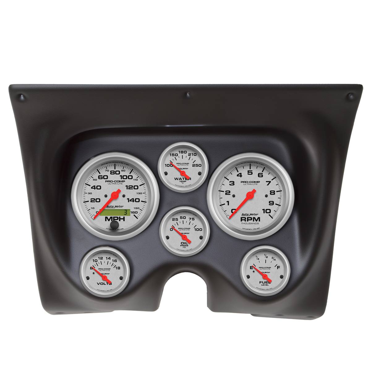 - Includes 3-3/8" Ultra Lite electric speedometer & tachometer and 2-1/16" electric fuel level (0/90 ohm), water temperature, oil pressure, and voltmeter