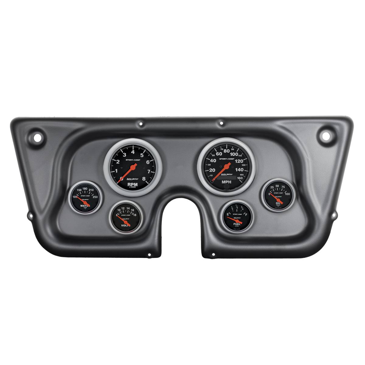 - Includes 3-3/8" Sport Comp electric speedometer & tachometer and 2-1/16" electric fuel level (0/90 ohm), water temperature, oil pressure, and voltmeter