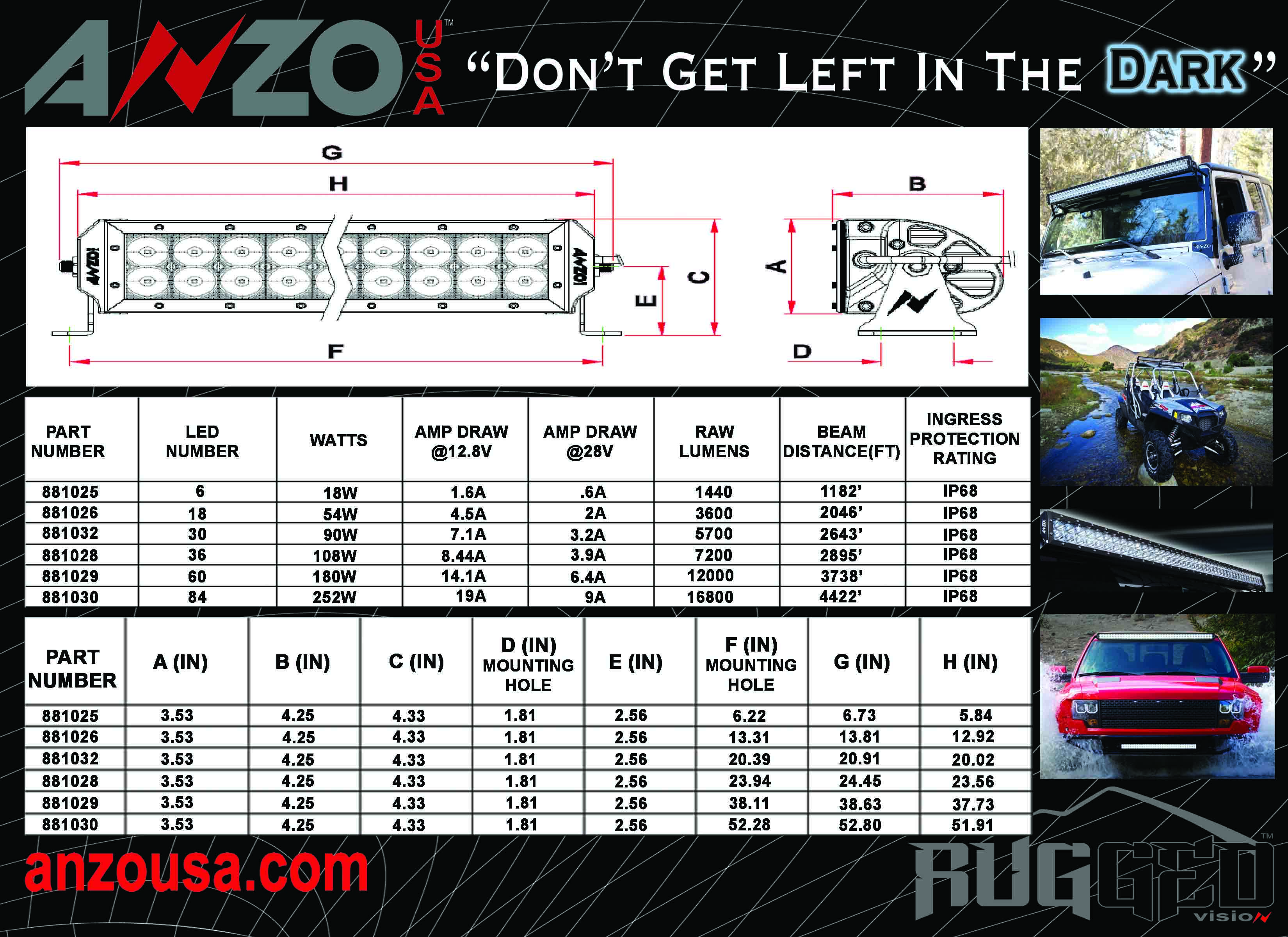 Rugged Vision, Off Road LED Light Bar, Rectangle, 38 in., 60 LEDs, High Output IP68 Rated, Can Be Submerged Up To 3 Meters. High Intensity LEDs. Polycarbonate lens. Black aluminum housing. Wiring Harness And Switch Included.