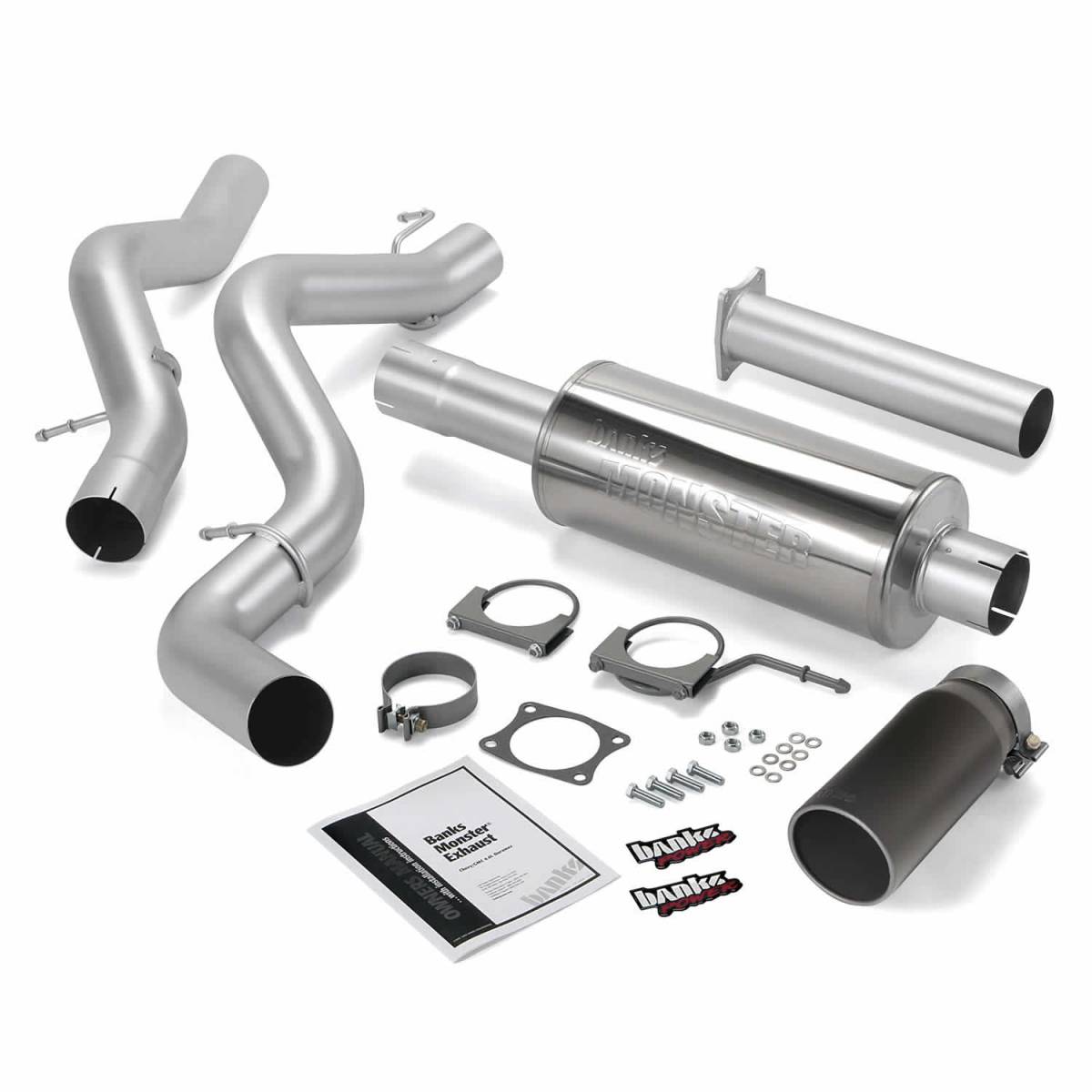 Physical fitment. Why consider a cheap, ill-fitting aluminized exhaust? Banks 4 inch Monster Exhaust is made of rugged, long-lasting 100 percent stainless steel. It fits better than the competition, because Monster Exhaust utilizes the factory hangers and maintains proper clearance to all under-vehicle components. All flow, show and go! With nearly five decades of engineering airflow improvements, Banks has mastered the art of maximizing flow while minimizing backpressure. The polished straight-through Monster Muffler, mandrel-bent head pipe assembly (non-cat-converter-equipped vehicles only), intermediate pipe(s) and tailpipe nearly triple the exhaust flow, cut backpressure up to 98 percent, lower exhaust gas temps and deliver more power to the ground. And the 5 inch polished rolled-edge tip has an adjustable clamp for positioning on tailpipe. Get it in your choice of chrome-over stainless or high temp black! Engineered to ditch the drone. Many straight-through mufflers deliver an obnoxious drone that overpowers conversations. Banks Monster Muffler is extensively sound-tested and engineered with a unique expansion chamber and high-temperature packing. Instead of a drone, you're treated to a rich exhaust note that's authoritative, yet civil. It sounds as great as it looks! 4 inch stainless constant-diameter pipes and straight-thru muffler improve flow up to 176 percent and lower EGTs. Cuts backpressure up to 98 percent, rich throaty sound.