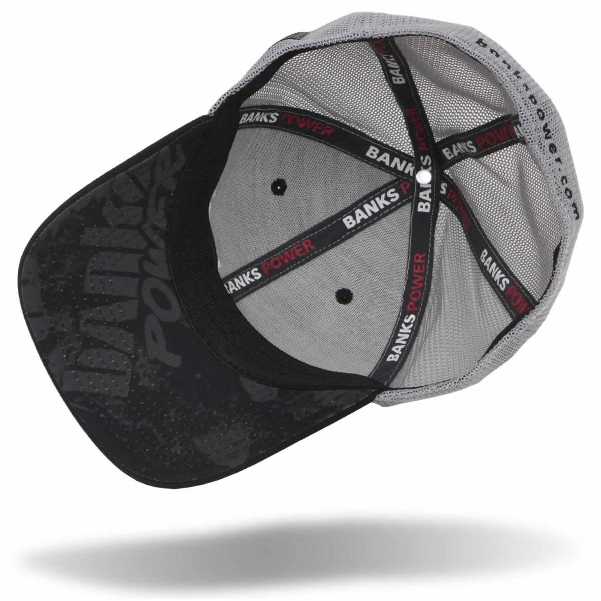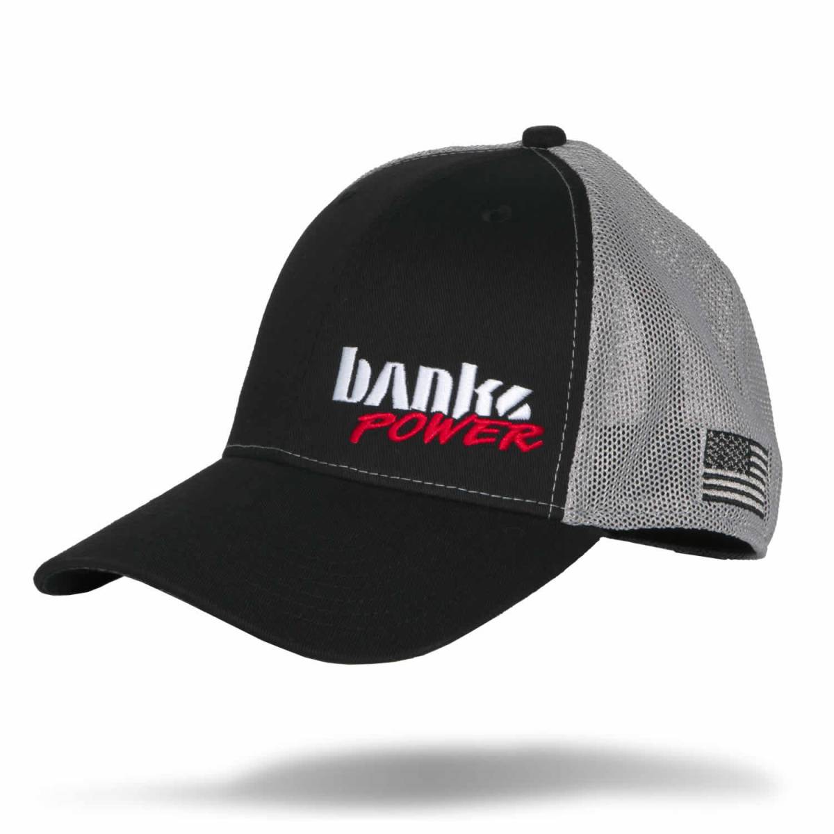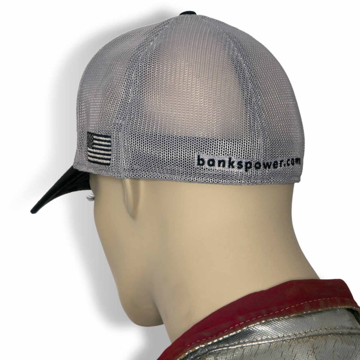 Banks Official Apparel twill/mesh snap back hat with Banks Power embroidered on the front. US Flag embroidered on left side and bankspower.com on the back. Black cotton twill front panels and visor with grey mesh back panels, pre-curved PE visor with custom Banks design on underside. Flexible Fit.
